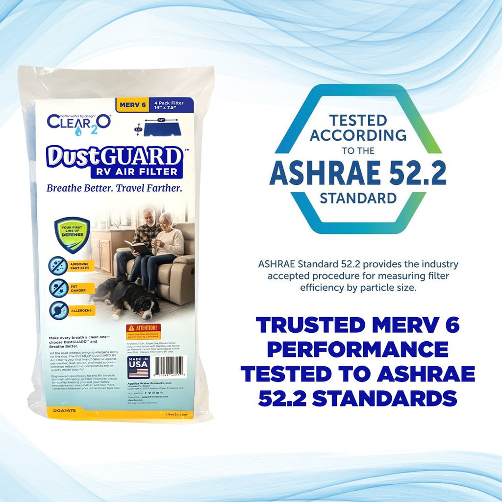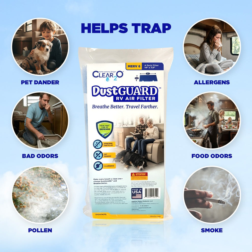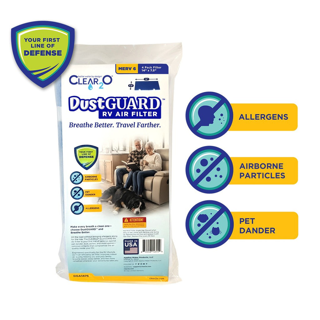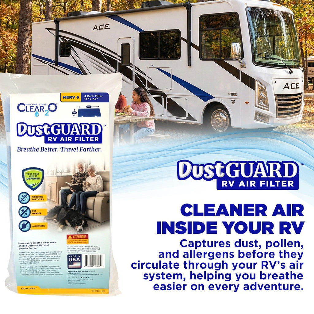 CLEAR2O DustGUARD™ RV Air Filters are engineered to help RVers breathe easier wherever the road takes them. Using high-performance tackified polyester media, DustGUARD™ filters are designed to capture and hold dust, pollen, and airborne particles before they circulate through an RV’s living space.