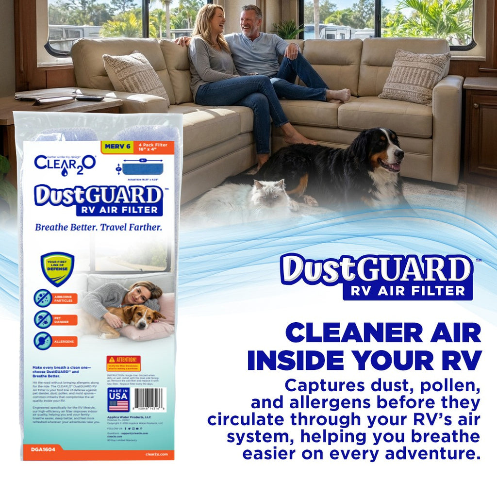 CLEAR2O DustGUARD™ RV Air Filters are engineered to help RVers breathe easier wherever the road takes them. Using high-performance tackified polyester media, DustGUARD™ filters are designed to capture and hold dust, pollen, and airborne particles before they circulate through an RV’s living space.